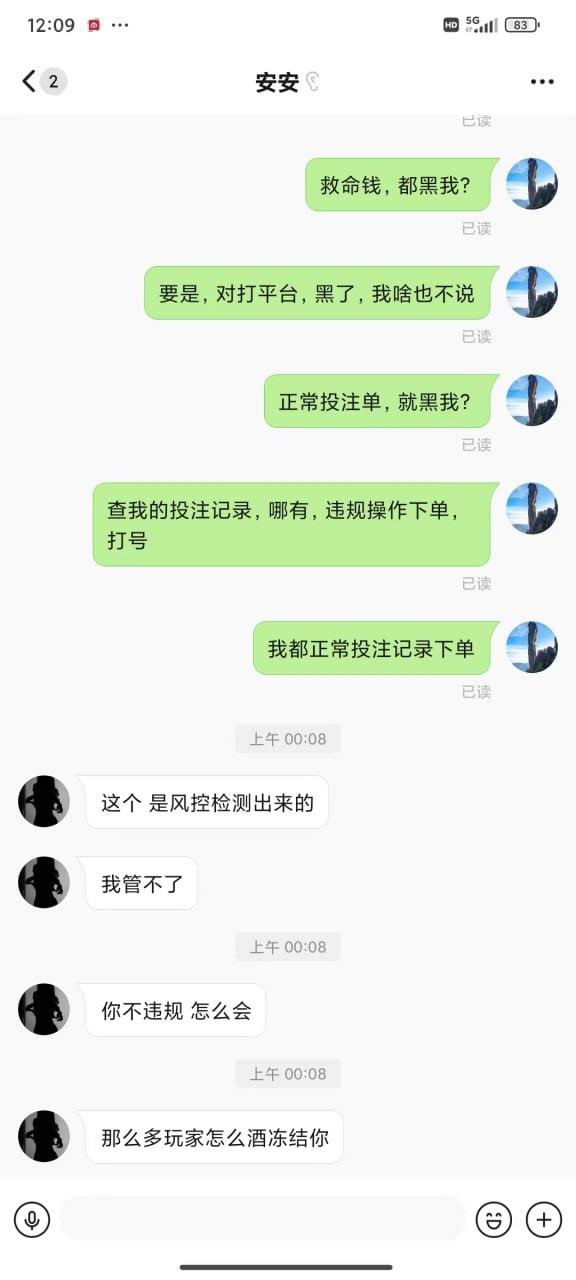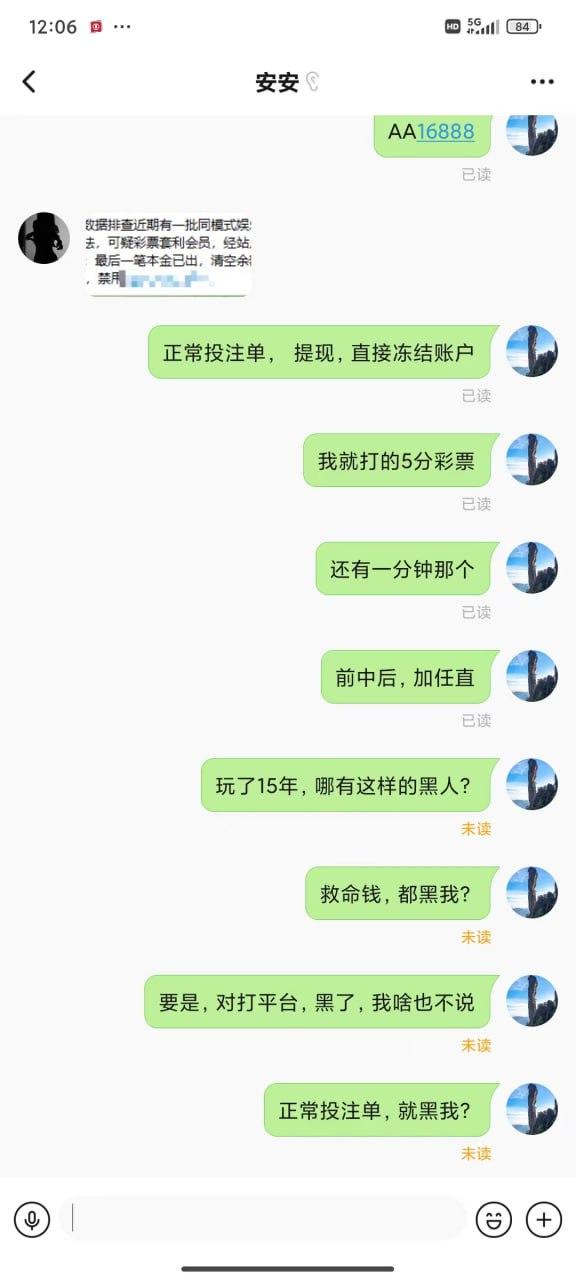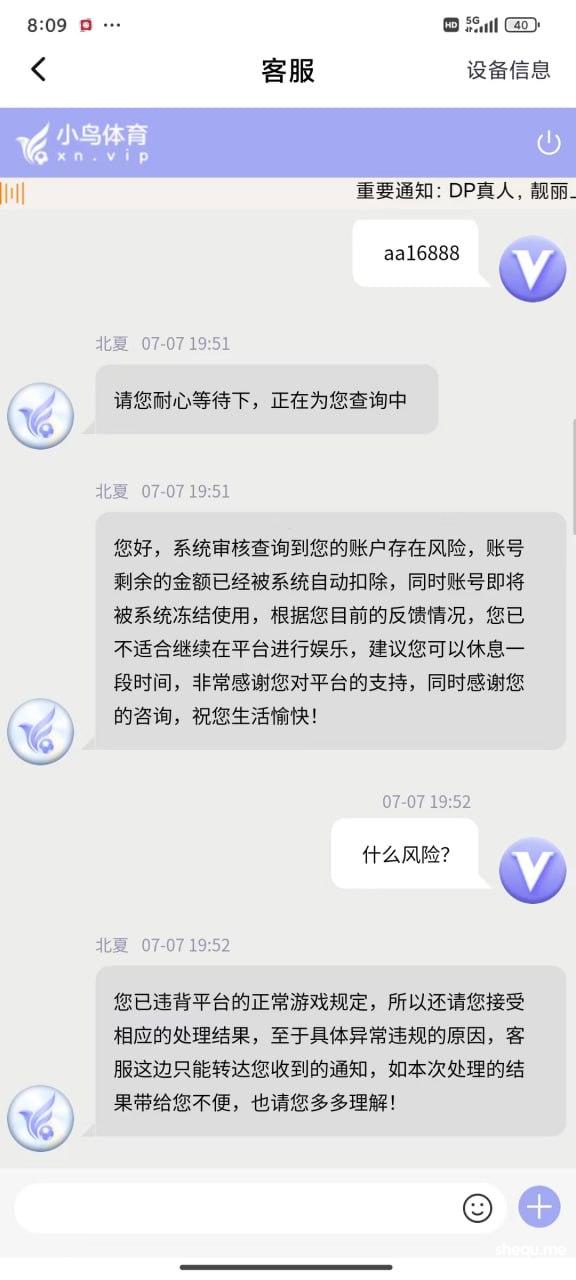 期间输输赢赢 提款都是正常的,可是就在昨天也就是7.7号充值了两千多,打了几个小时余额来到了2W,随后提款等了半小时都没有到账,期间还在投注,突然提示被迫下线,再登陆就显示账户异常。请联系客服。联系客服:就说违规投注持续关注@xinwen1看后续。至于怎么违规也说不出各所以然。玩彩票多年从来也没遇到过这样的事情。(本人玩法:喜欢追豹子,前中后豹子,任选豹子,45=23 89=23单式54注)在此希望得到曝光这样的垃圾平台,惊醒还在小鸟玩的其他玩家。这样的形式做法迟早玩完!